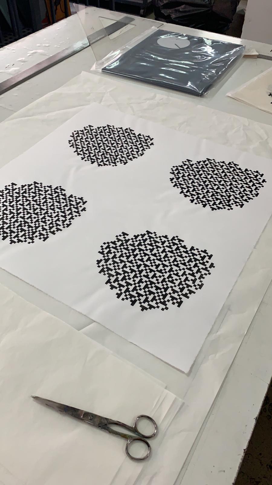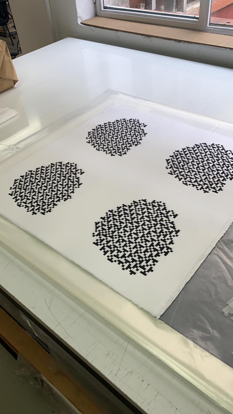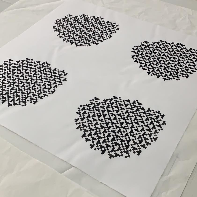 The subject is a fractal that can grow infinitely on all sides. I once saw a narrow bite of this pattern on a Roman mosaic from Merida in Spain. It fascinated me because the pattern is recognizable and yet not so. The narrow piece could not be doubled or flipped and it took me most of that summer to figure it out. That it was a fractal with 3-4 simple rules. The white T and the black T must always turn their backs on each other. You must avoid more than 3 black squares in succession of each other diagonally as it becomes too visible. And the T's may not meet at the bottom, but otherwise you can turn and flip them for good. But you have to be focused because it can become more or less beautiful or less beautiful.