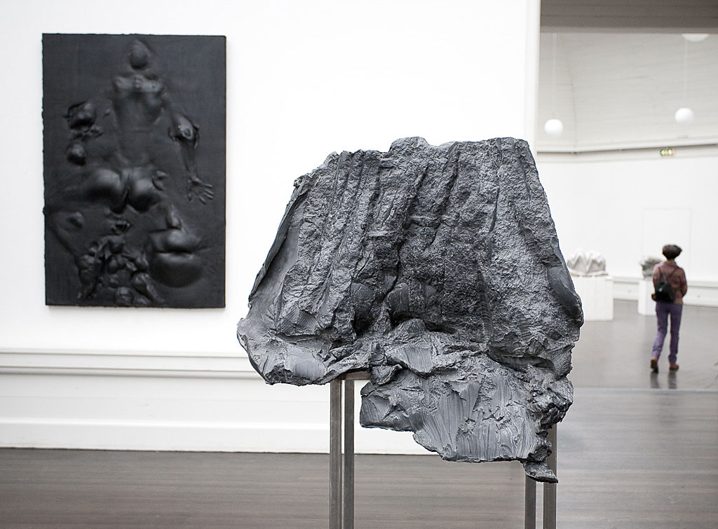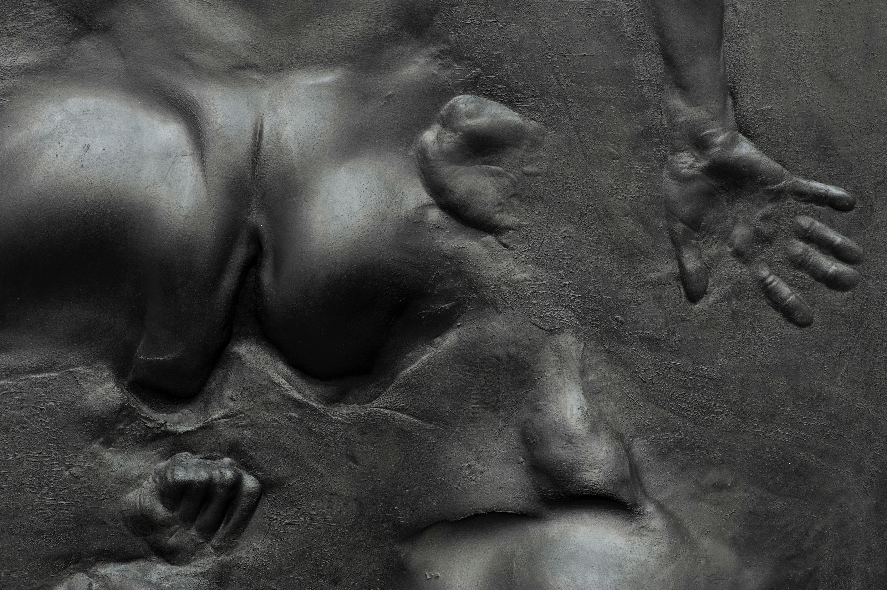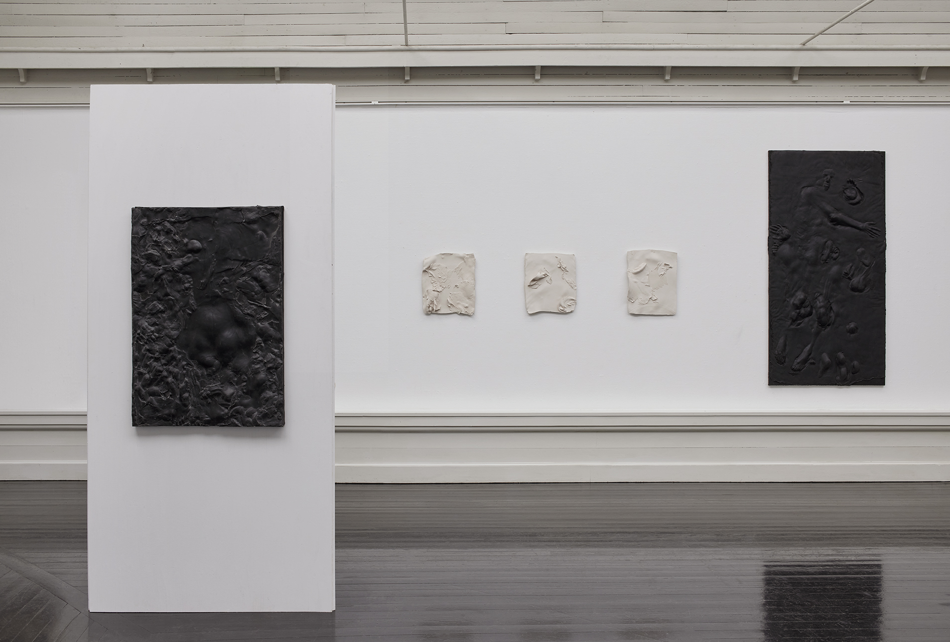 Three black rubber reliefs: "Östi" 2010, "Fossil in Rubber III" 2013 and from 2023 "Fossil in Rubber V”. The fossil-like surface, which I have always been moved by, reflects traces of lives ending, the frozen moment when a living being turns into a fossil, the position they land in forever, is often very beautiful in a pure and scientific sort of way.